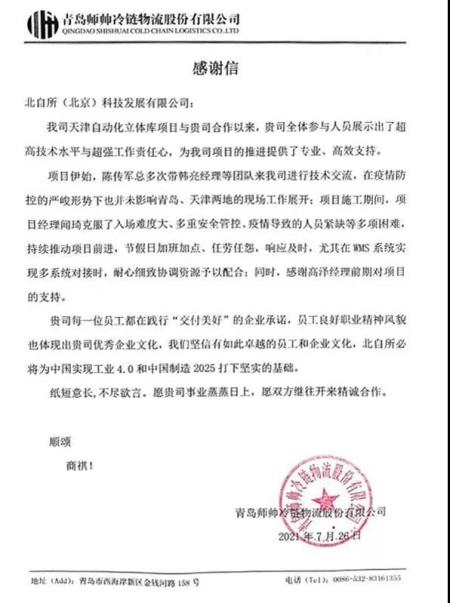 項(xiàng)目執(zhí)行過(guò)程中,正值新冠疫情在我國(guó)冷鏈行業(yè)肆虐之時(shí),北自科技團(tuán)隊(duì)展示了良好的精神風(fēng)貌和職業(yè)素養(yǎng),克服了重重困難,以認(rèn)真的態(tài)度、專業(yè)的管理和過(guò)硬的技術(shù)感動(dòng)了客戶,客戶特地發(fā)來(lái)感謝信,以表彰北自科技團(tuán)隊(duì)在項(xiàng)目中的突出表現(xiàn)。