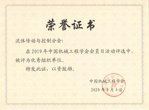 2020年8月,流體傳動(dòng)與控制分會(huì)憑借形式多樣,內(nèi)容豐富的會(huì)員日活動(dòng),在“2019年中國(guó)機(jī)械工程學(xué)會(huì)會(huì)員日”活動(dòng)評(píng)選中被評(píng)為優(yōu)秀組織單位。