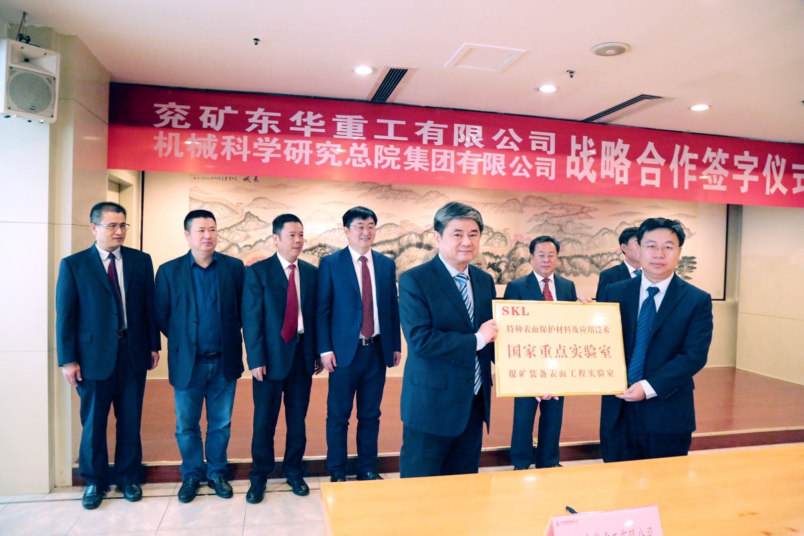 特種表面保護(hù)材料及應(yīng)用技術(shù)國家重點實驗室在東華重工設(shè)立煤礦裝備表面工程實驗室,材保所總經(jīng)理吳勇授牌,趙峰代表東華重工接牌。